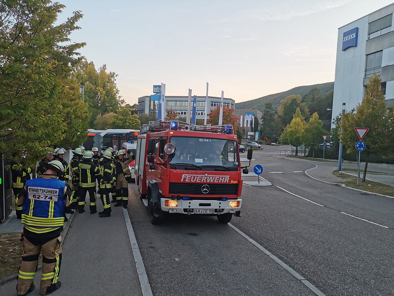 Sofort nach der Alarmierung rückte das erste Fahrzeug der Werkfeuerwehr mit dem Einsatzleiter aus. Nach einer kurzen Erkundung alarmierte er weitere Kräfte der Freiwilligen Stadtwehr zur Unterstützung. Gleichzeitig wurden die Drehleiter der Feuerwehr Aalen und die Zeiss-Sanitätsstaffel alarmiert.