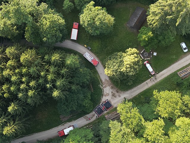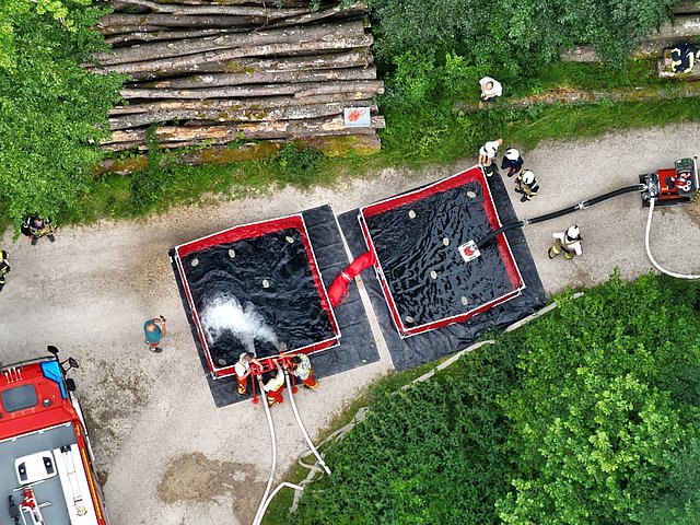 Bei der Übung waren insgesamt fünf Löschfahrzeuge beteiligt, die im Pendelverkehr rund 40.000 Liter Wasser an die Einsatzstelle transportierten. Unterstützt wurde der Einsatz durch zwei Gerätewagen, die Pumpen, Schläuche und weitere Ausrüstung zur Wasserförderung in schwierigem Gelände mitführten.