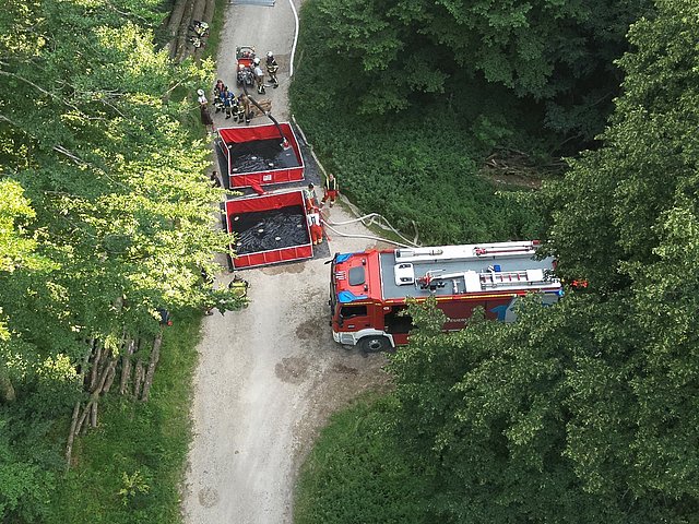 Eine der größten Herausforderungen bei Waldbränden ist die Löschwasserversorgung. In abgelegenen Waldgebieten fehlen meist Hydranten oder andere Wasserentnahmestellen. Deshalb müssen lange Schlauchleitungen mit zwischengeschalteten Pumpen verlegt werden, um das Wasser zur Einsatzstelle zu bringen.