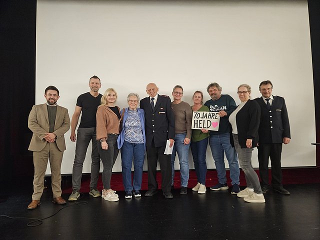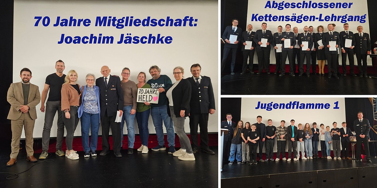 Eine besondere Ehrung erhielt Joachim Jäschke. Er trat 01. Juni 1956 in die Feuerwehr ein, besuchte alle Lehrgänge bis zum Gruppenführer und besitzt das Leistungsabzeichen in Gold. 1999 wechselte er nach hunderten Übungen und Einsätzen nach 43 Jahren aktivem Dienst in die Altersgruppe. 2005 wurde Jäschke zum Ehrenmitglied ernannt. Bernd Betzler würdigte seine Arbeit sehr und betonte, dass Jäschke auch im hohen Alter sogar an seinem Geburtstag zum Heidefest kommt. Nun konnte Jäschke seine 70-jährige Zugehörigkeit feiern. Begleitet wurde die Ehrung durch seine Familie, die als Überraschung angereist war, um mit ihm zusammen auf der Bühne die Ehrung entgegenzunehmen.