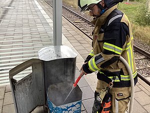 Am Vormittag brannte ein Mülleimer am Bahnhof, der von uns mit der Kübelspritze schnell gelöscht werden konnte. Vermutlich handelte es sich um Brandstiftung, da es in der näheren Umgebung sowie in Aalen zu ähnlichen Taten kam.