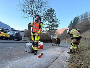 Am Samstagnachmittag wurden wir von der Polizei in die Heidestraße nachgefordert, da nach einem kleinen Vekrehrsunfall bei einem PKW Betriebsstoffe ausliefen. Die Fahrerin war über einen vom Hang herabgefallenen Stein gefahren, wodurch die Ölwanne des Fahrzeugs beschädigt wurde. Wir nahmen die auslaufenden Betriebsstoffe mit Ölbindemittel auf und verließen anschließend die Einsatzstelle.