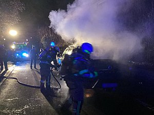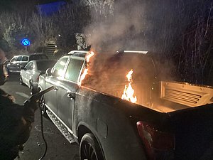 Eine Stunde nach Neujahr alarmierte die Leitstelle zu einem Pkw-Brand in den Tiersteinweg. Vor Ort brannten bei einem Pick-Up eine Säule sowie die Ladefläche. Der Brand wurde mittels Schnellangriff gelöscht.