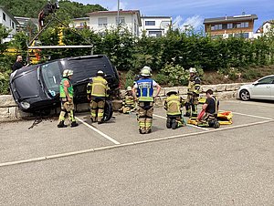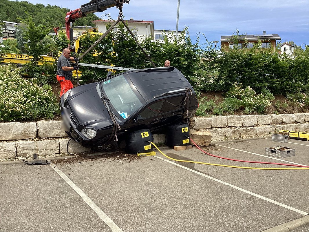 Zur Mittagszeit wurden wir zu einem Verkehrsunfall auf dem Parkplatz des Friedhofes an der Kapellensteige gerufen. Vor Ort fanden wir einen PKW vor, der offensichtlich vom oberen Parkplatz über die Begrenzung auf den unteren Parkplatz gefahren war und dort schräg auf zwei geparkten PKW zum Stehen kam. Bei unserem Eintreffen war der Fahrer bereits durch anwesende Passanten aus dem Fahrzeug befreit worden. Er wurde dem gleichzeitig eintreffenden Rettungsdienst übergeben. In Absprache mit der Polizei wurde ein Abschleppwagen mit Kran alarmiert, der den PKW aus seiner Position befreite. Wir unterstützten die Mitarbeiter des Abschleppdienstes, indem wir den PKW mit unserem Hebekissen unterbauten, so dass der Kran den PKW von beiden Seiten sicher aufnehmen konnte. Abschließend wurde die Einsatzstelle an die Polizei und das Ordnungsamt der Stadt Oberkochen übergeben.